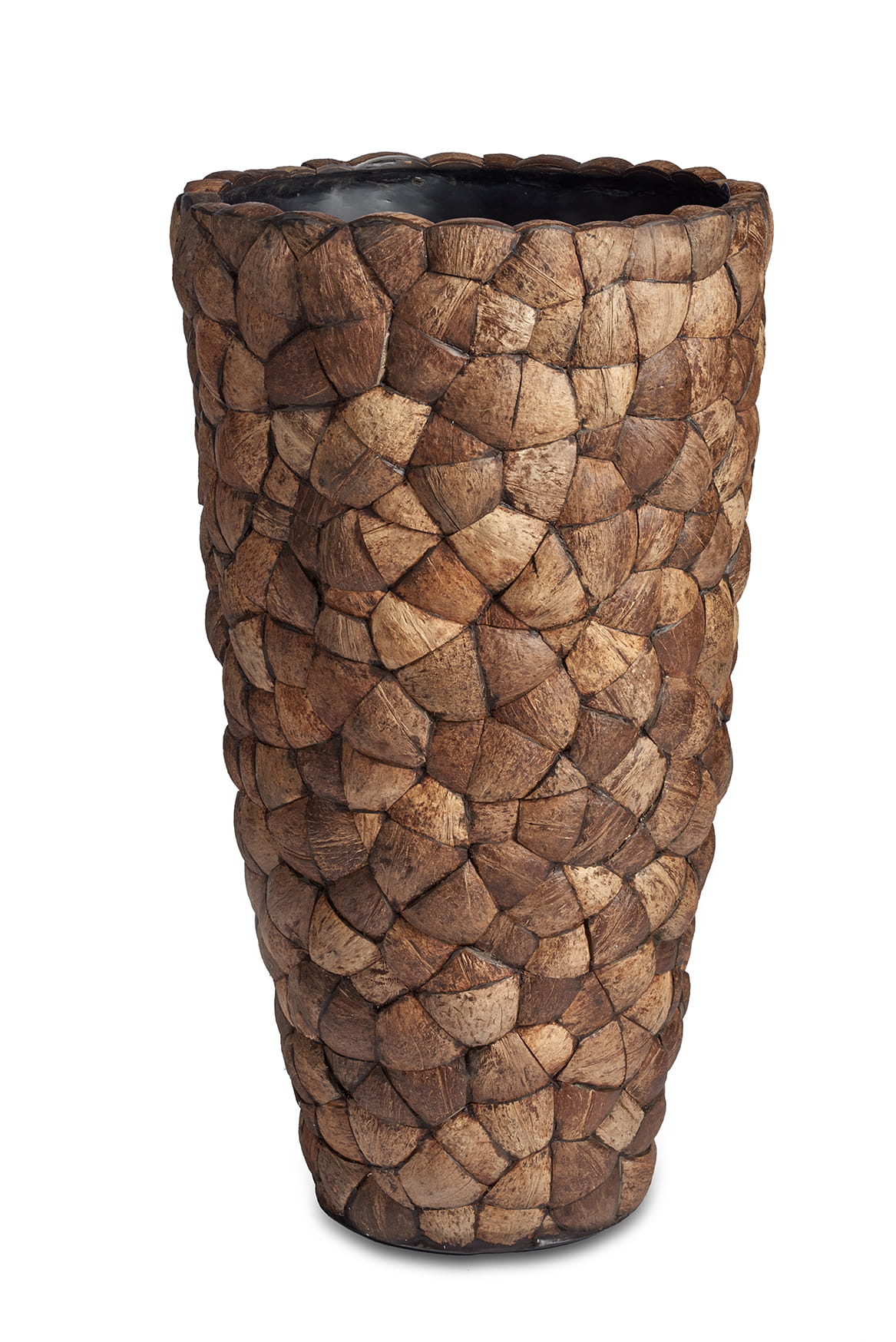 Donica została stworzona z trwałych materiałów. Trapezoidalne łupiny kokosa otaczają misę, tworząc intrygujący, trójwymiarowy wzór. Naturalny rysunek kory daje rustykalnego, organicznego charakteru oraz nadaje unikalną fakturę.