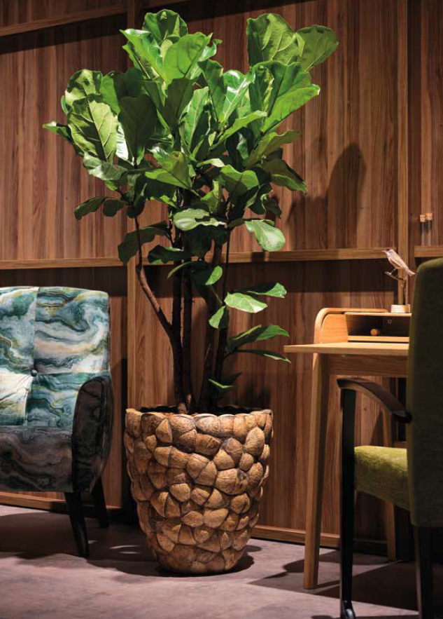 Przez naturalne wykończenie, donica idealnie komponuje się z przestrzeniami bazującymi na surowych materiałach. Wprowadza ciepło i równowagę w pomieszczeniach, gdzie dominują kamień, beton lub elementy loftowe, ale też doskonale podkreśla piękno drewnianych podłóg i mebli.
