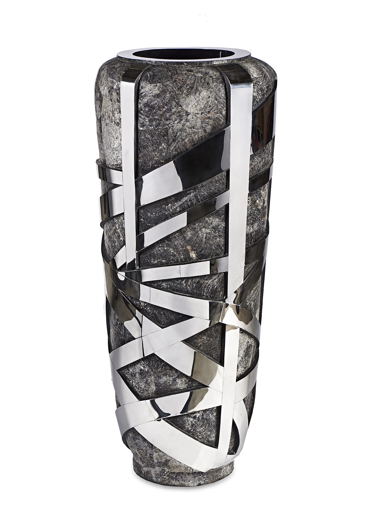 Materiał/kolor/tekstura: surowa spękana skorupa oraz polerowana stal nierdzewna